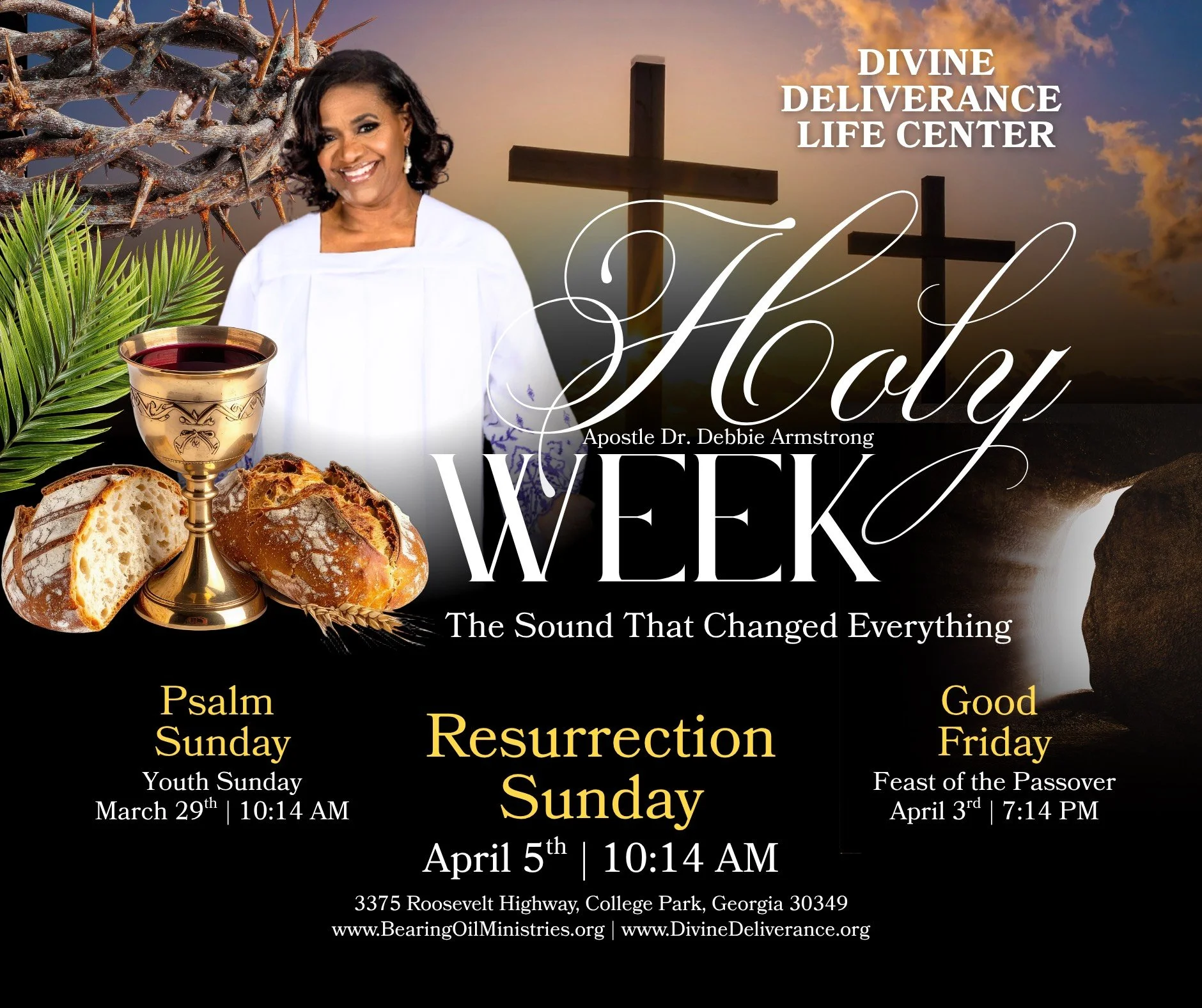 Holy Week -The Sound That Changed Everything Sunday, March 29, 2026 10:14 AM 10:14 Sunday, April 5, 2026 10:14 AM 10:14 Bearing Oil Ministries Fellowship International 3375 Roosevelt Highway Atlanta, GA, 30349 United States (map) Google Calendar ICS